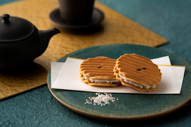 「プレミアム千寿せんべい」生地は独自のブレンドで配合した国産小麦を使用。ザラメのザクザク感と濃厚な風味職人のこだわりによって生み出された一品です。